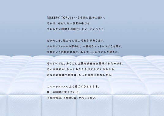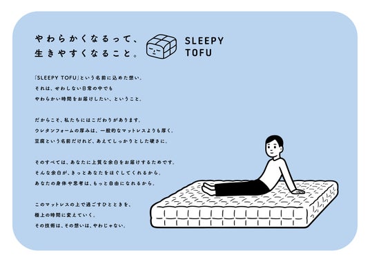 SLEEPY TOFUはこれからも、マットレスを超えて、人の生き方や暮らし方そのものを問い直すような、そんなブランドでありたいと願っています。