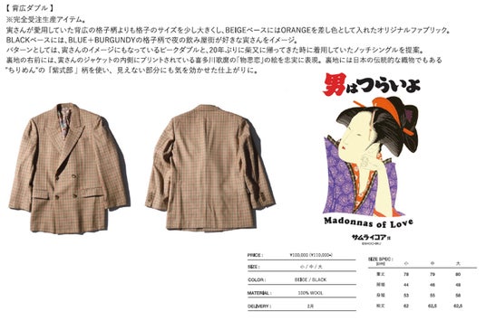 寅さんの象徴ともいえる背広は、オリジナルファブリックで現代に蘇らせ、ピークダブルとノッチシングルで展開しています。
