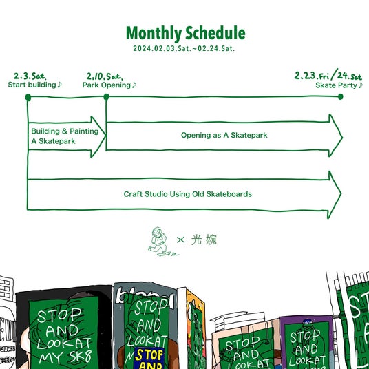 2月3日から2月24日までの間、アートとスケボーで遊ぶ1ヶ月。パークを皆で制作し、ペイントをするワークショップを実施。完成日には音楽イベントも。ビル4階の工場跡地に新しくできた〈光婉〉にて。