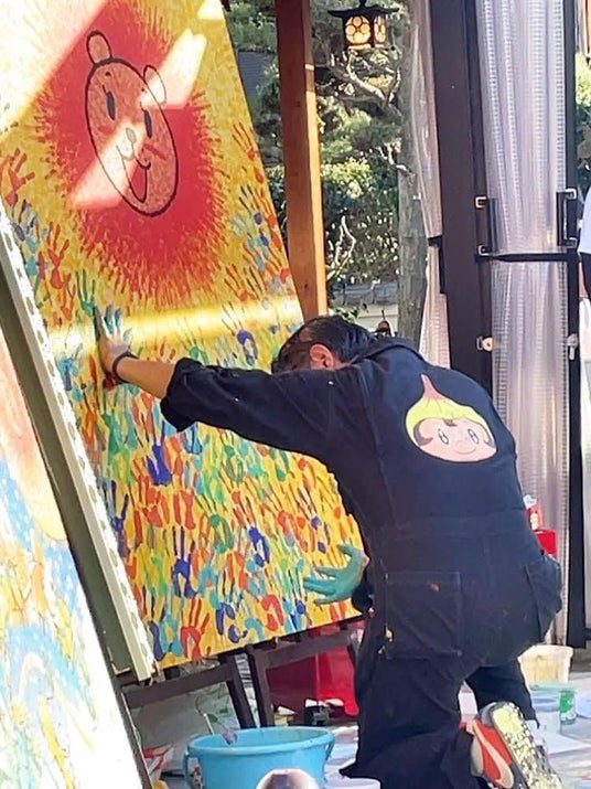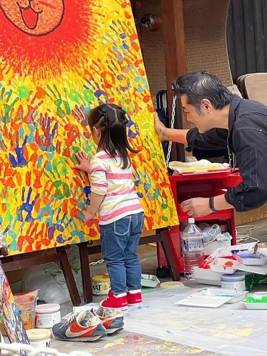2月18日(土)八尾市の茶吉庵にてプレイベント開催。野外でライブペインティング。そして、八尾児童合唱団卒団生のハミールの歌声を聴きながらのコラボLIVEを開催。今回は新たなチャレンジ。全て指で描き、手のひらも使い表現。最後に子供たちにも手のひらで参加してもらいました。