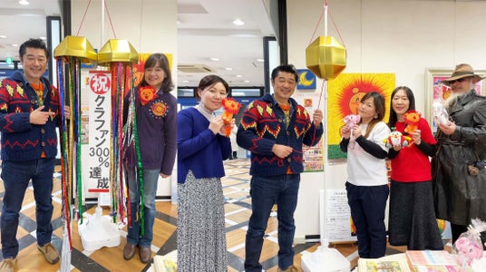 記念展に向けて機運が高まる。300%達成時、実行委員や応援団の計らいでくす玉割りも行われた。