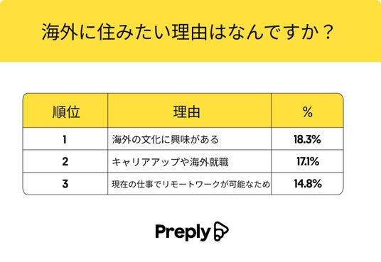 オンライン英会話をはじめ、講師とマンツーマンで学習ができる語学学習プラットフォームを提供するPreply(プレプリー / 米・サンフランシスコ)は、18歳~29歳の日本の若者を対象に「海外移住願望」について調査を行いました。日本の若者の海外移住願望の有無や、その背景、また、海外移住にあたって「言語の違い」という障壁があるのかなど、さまざまな項目ついて調べました。