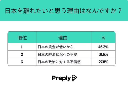 - 日本を離れたいと思う理由の1位は「日本の賃金が低いから」。海外に住みたい理由の1位は「海外の文化に興味があるため」