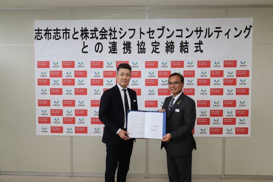 (株)シフトセブンコンサルティング 井本 憲史代表取締役(左)、志布志市長 下平 晴行(右)