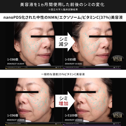 nanoPDS化された中性のNMN/エクソソーム/ビタミンC(37%)美容液美容液→シミに変化なし 一般的な濃度25%ビタミンC美容液→シミが増加