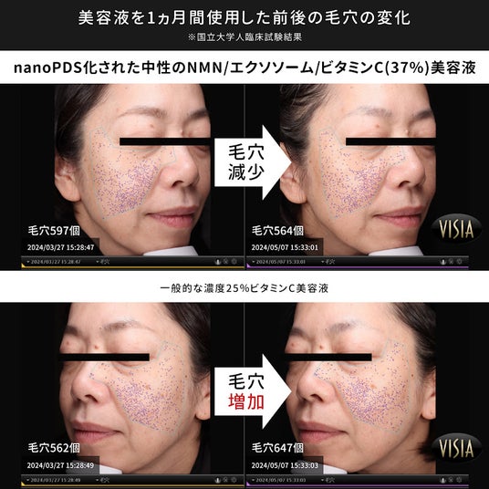 nanoPDS化された中性のNMN/エクソソーム/ビタミンC(37%)美容液→毛穴が減少 一般的な濃度25%ビタミンC美容液→毛穴が増加