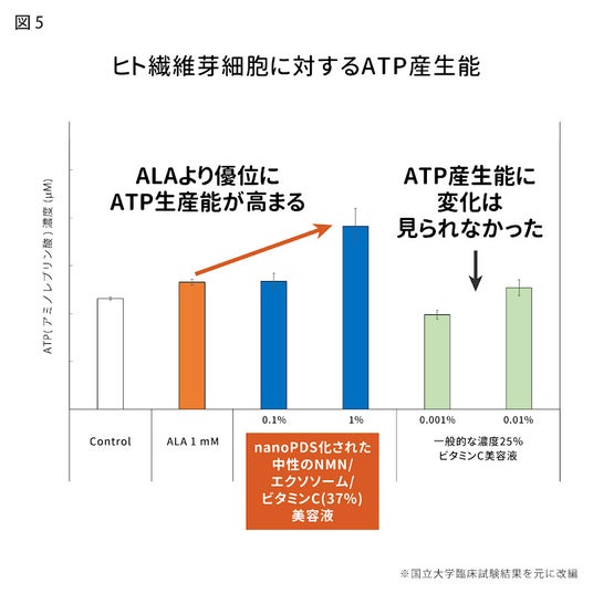 nanoPDS化された中性のNMN/エクソソーム/ビタミンC(37%)美容液ではNMNの効果により1%の濃度ではALA(アミノレブリン酸)と比較しても優位にATP生産能が高まることが確認され、一般的な濃度25%ビタミンC美容液ではATP産生能に変化は見られなかった。(図5)