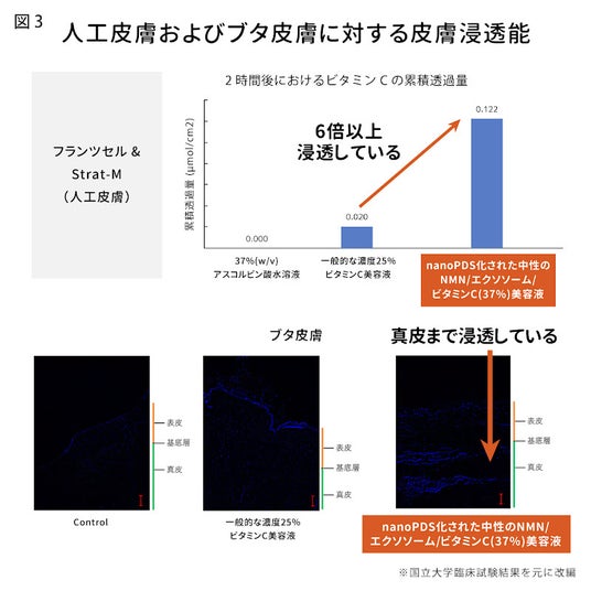 また、nanoPDS化された中性のNMN/エクソソーム/ビタミンC(37%)美容液は極めて高い皮膚浸透性を示した。
