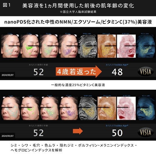 さらに、ヒト臨床試験においてnanoPDS化された中性のNMN/エクソソーム/ビタミンC(37%)美容液は毛穴やシワの減少効果や肌年齢の若返り効果が確認された。なお、臨床試験は現在実施中であります。