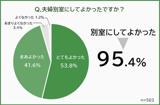 「夫婦別室にしてよかったか?」という質問には、「とてもよかった」「よかった」と回答した人が合わせて9割以上にのぼりました。生活リズムの違いやいびきなどの問題を解消するために夫婦別室を選んだ人が多いため、問題が解消して満足しているのでしょう。