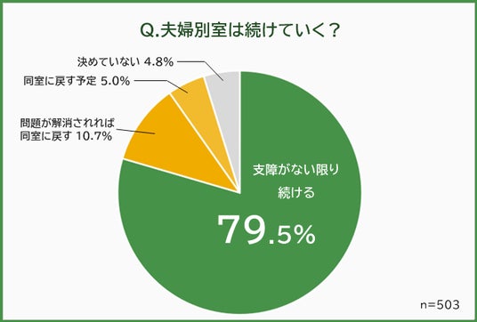 一方で「子どもの夜泣きがおさまる」「夜勤から外れる」「いびきが改善する」など、夫婦別室の理由となっていることが解消したら同室に戻す予定の人も1割強。夫婦同室へ戻るために、いびき治療に取り組んでいるというコメントもありました。夫婦別室は一時的な措置と考えているご夫婦もいるとわかります。