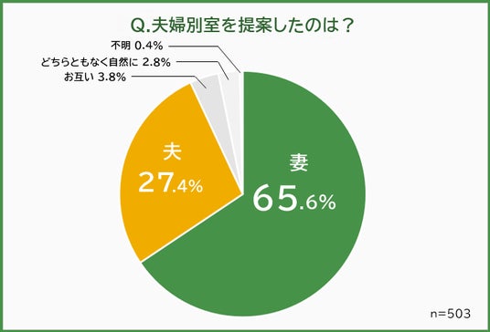 夫婦別室を提案したのは「妻」が65.6%。男性のほうがいびきをかきやすいとされているため、夫のいびきに悩む女性から提案するケースが多いようです。