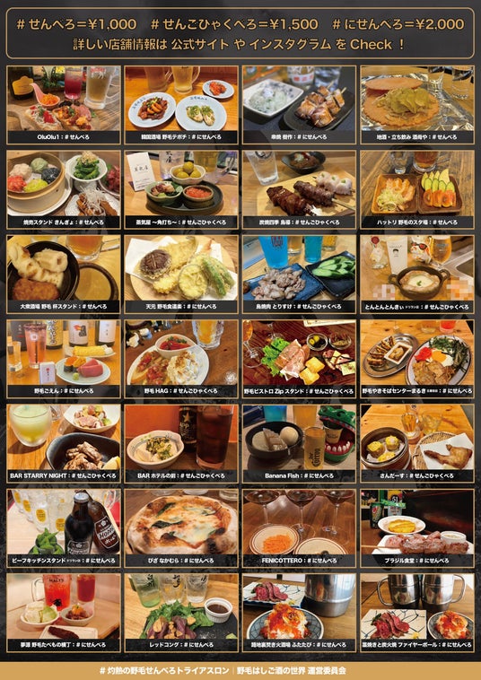 メニューや価格帯が「多種多様」な野毛の街を楽しんでいただくため、お値段に比べて満足度が高いこと、またお客さまが概ねお安いと感じるであろうことを考慮し「#せんべろ = ¥1,000-」「#せんごひゃくべろ = ¥1,500-」「#にせんべろ = ¥2,000-」の3価格帯に統一。