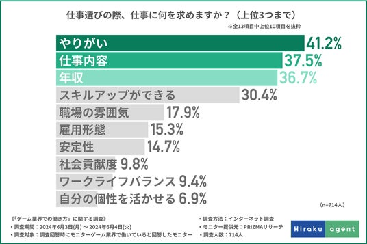 また、約4割の方が、仕事を選ぶ際には「やりがい」を求めている方が最多となり、「仕事内容」や「給与」を上回ることが明らかになりました。ゲーム業界で働く方にとって、やりがいは特に重要視されていることが示されました。