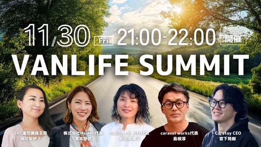 女性向けにキャンピングカーをデザイン・販売する株式会社MeiMei(本社: 東京都渋谷区道玄坂1-10-8渋谷道玄坂東急ビル2F-1、代表取締役:宮本芽依)は、2024年11月30日(土)、オンラインイベント「VANLIFE SUMMIT」を初めて開催します。本イベントは、バンライフ初心者、経験者、そしてバンライフ関連企業が一堂に会し、リアルな声を共有することでバンライフ文化の可能性を広げる場です。