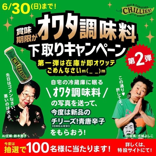 「辛いもの好き」に特化したメディアを運営する辛メーター株式会社(福岡市中央区、代表取締役CEO:江口 カン)は、使わなくなった調味料(辛くなくても可)を写真で撮影して応募いただいた方に、辛メーターおすすめの辛味調味料「ピエトロ CHILLIES!(チリーズ)」新品1本をプレゼントするキャンペーンの第2弾を受付開始しました。(締切:6月30日)