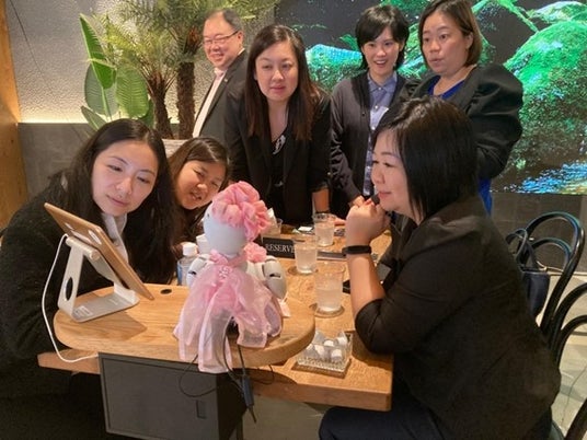 ▲アバターロボットを活用した身体障碍者インクルーシブ社会の実践カフェ「アバターロボットカフェ」を視察する代表団