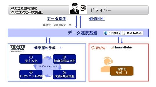 この度、「安全はすべてに優先する」を掲げ、厳正な運行管理、健康管理などを積極的に取り組むアルピコ交通、アルピコタクシーと、新たなモビリティ分野の「仕組み」と「ビジネス」の創造に取り組むトヨタ・コニック・アルファが共同で、ヒヤリハットと相関のある「健康指標」をドライバー毎に判定し、健康改善プログラムを提供する「健康運転サポート(特許出願中)」とWizWeの習慣化をサポートするプラットフォーム「Smart Habit」のサービス間におけるデータを連携させ、共創サービスの価値検証をすることに至りました。