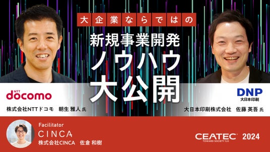 パネルディスカッションでは、新規事業の創出に積極的な株式会社NTTドコモ、大日本印刷株式会社の2社に登壇いただき、モデレーターを務めるCINCAの佐倉とともに新規事業開発のノウハウを共有します。大企業ならではの新規事業立ち上げの際に直面する課題とその乗り越え方、新規事業立ち上げのパートナーを外部に求めることのメリットについて深堀りしながら皆さまにお伝えしていく予定です。