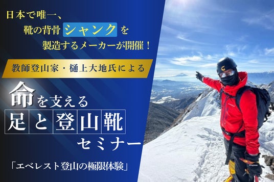 株式会社田中務補商店(本社:兵庫県神戸市、代表取締役:田中伸明)は、日本唯一のシャンクメーカーとして、靴業界の発展を支えてまいりました。シャンクとは靴の中に組み込まれる金属製の部品で、靴の形状を保ち、歩行時の安定性を高める重要な役割を担っています。国産靴の生産量が年々減少し続ける中、日本の靴産業が再び注目を浴び、活性化することを目指し、業界を超えた新たな取り組みを進めています。その一環として、特別セミナー 「【命を支える足と登山靴】エベレスト登山の極限体験」 を開催いたします。本セミナーでは、エベレスト登頂を目指す登山家の 樋上大地氏 をお招きし、昨年のエベレスト登山経験を「足」と「靴」という視点から語っていただきます。