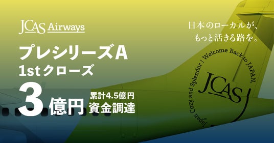 2026年春の新規就航を目指す株式会社ジェイキャスエアウェイズ(本社:東京都千代田区、代表取締役白根 清司・梅本 祐紀、以下「当社」)は、この度、第三者割当増資により、プレシリーズAラウンドのファーストクローズとして3億円の資金調達を実施し、設立からこれまでの累計調達額が約4.5億円となることをお知らせいたします。