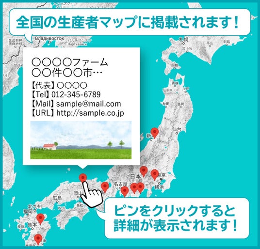 ・地図上で農場の場所などを公開し、バイヤーが貴社の情報へのアクセスを容易にする。