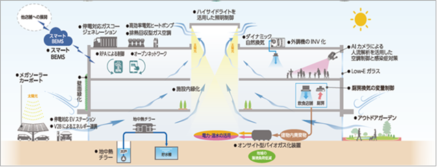 延べ床面積10万平方メートル 以上の施設として初めてZEB Ready認証を受けており、商業施設の脱炭素のモデルといえる高い省エネ性能を有しています。また、資源循環の観点では、Daigasエナジー株式会社が開発したオンサイト型バイオガス発生設備及びコージェネレーション設備を設置し、施設内で出る食品残渣を電力・温水として活用し、廃棄物を大幅に抑制しています。さらに、お客さまのご自宅の再エネで充電したEVから建屋内へ放電を行うことを目的としたV2B設備を導入し、対価としてショッピングに利用できるポイントを付与することにより、EVを媒体とした地域内再エネ融通を促進しており、EV保有者の行動変容に大きく寄与しています。