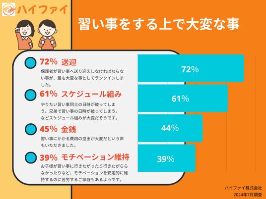 習い事をする上で保護者が大変だと感じる事は、72%が「送迎」、61%が「スケジュール組み」、45%が「金銭的に」、39%が「お子様のモチベーション維持・管理」と回答。