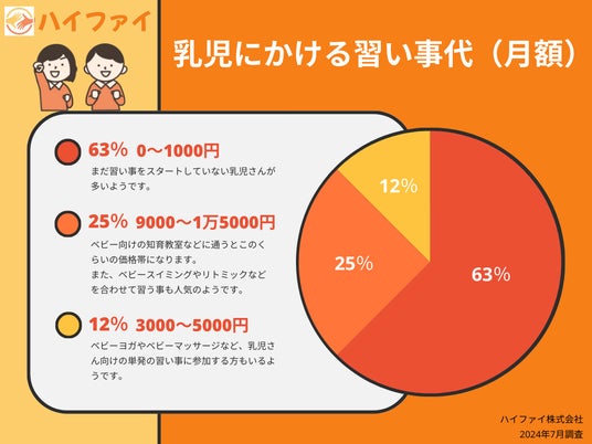 乳児にかける習い事代(月額)調査によると、63%が「0~1000円」、25%が「9000~1万5000円」、12%が「3000~5000円」という結果。まだ習い事を始めたことのない乳児が大半の一方で、ひと月に1万円以上のお金をかけてベビー向け知育教室や音楽リトミックに通う家庭も多いようです。