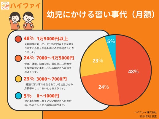 幼児にかける習い事代(月額)は、48%が「1万5000円以上」、24%が「7000~1万5000円」、23%が「3000~7000円」、5%が「0~1000円」という結果。
