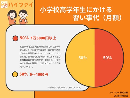 小学校低学年生にかける習い事代(月額)は、50%が「1万5000円以上」、50%が「0~1000円」という結果。