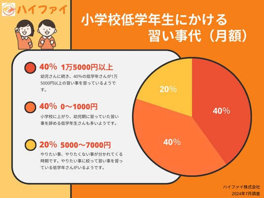 小学校低学年生にかける習い事代(月額)は、40%が「1万5000円以上」、40%が「0~1000円」、20%が「5000~7000円」という結果。