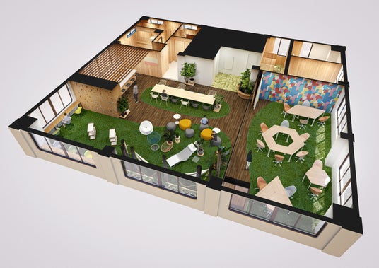 休憩スペースのコンセプトは“OKABEの「庭」”です。この“庭”には、“2階”と“輪”が生まれる場所という2つの意味が込められています。従業員が自然に囲まれて仕事の合間にリフレッシュできるだけでなく、コミュニケーションを育む場でもあります。観葉植物と自然が織りなす落ち着いた空間で、デスクでは得られないリラックスしたひと時を過ごし、社内に笑顔と会話が生まれる場所となることを期待して作られました。