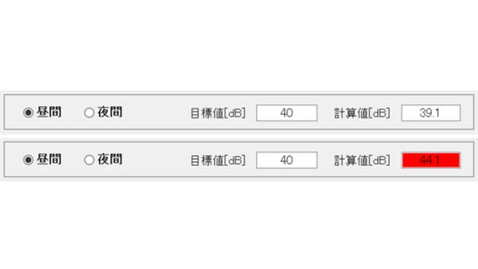 計算結果は、計算値が目標値を満足する場合は、ダイアログの計算値欄にセルの背景を「白」にして表示され、目標値を超過する場合はセルの背景を「赤」にして表示されます(図-3)。 室内騒音の予測計算は、目標値を満足する外周壁開口部の遮音仕様が定まるまで、繰り返し実施します。