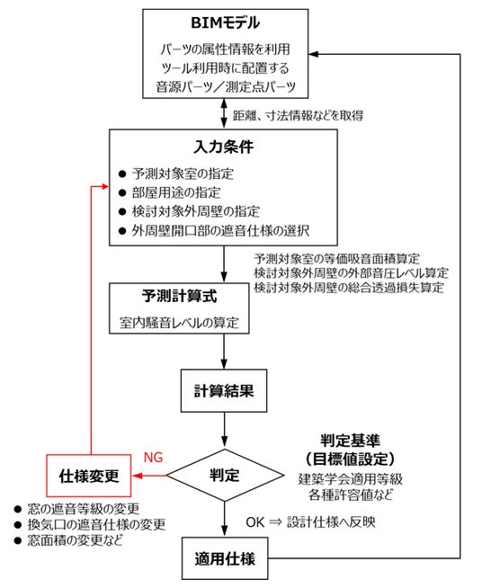 BIMアドインツールとして、1.ユーザーによるBIMモデル内への音源パーツ、測定点パーツの配置から、2.予測対象室の指定及び用途の指定、3.予測対象室外周壁開口部の遮音仕様の設定、4.室内騒音レベル目標値の設定、5.予測計算の実行、6.計算結果の判定までをシステム化し(図-1)、これまで表計算ソフトを用いて図面を並べて机上で行っていた予測計算を、BIMソフト上で連携して行うものとしました。