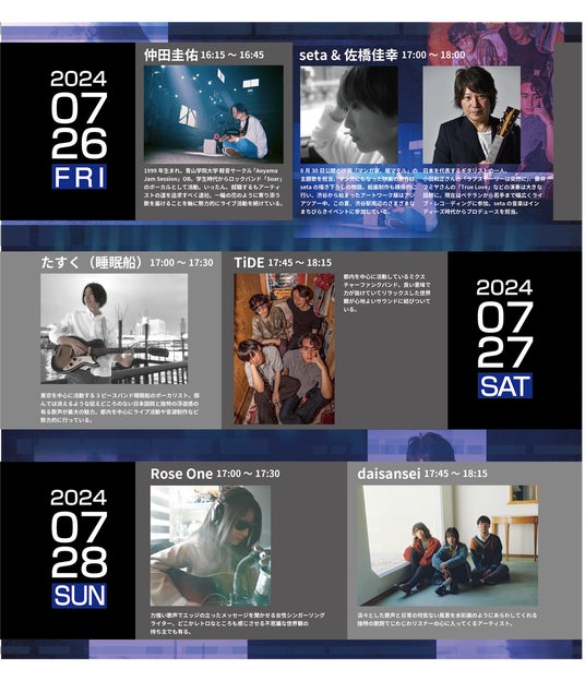7月26日(金)16:15から地元の青山学院大学出身のアーティスト仲田圭佑が登場するほか、17:00からは、setaと佐橋佳幸による名曲カヴァーライブ「うたのカレンダー」の開催が決定しています。