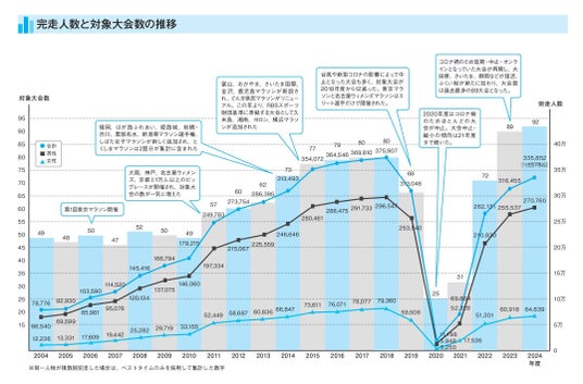 一般財団法人アールビーズスポーツ財団は、2024年4月から2025年3月の1年間、日本国内で開催されたフルマラソンの各種データをまとめた「全日本マラソンランキング」を発表しました。対象大会数は92大会(前年度89大会)で過去最多、完走者数は33万5,852人(前年度から1万9,397人増)※注 でした。
