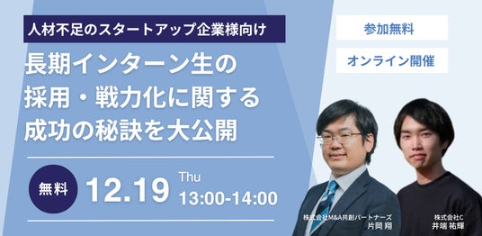 Cloud Link Group株式会社(本社:東京都港区、代表取締役社長:梅野 且貴、以下「クラウドリンクグループ」)の子会社である株式会社M&A共創パートナーズ(本社:東京都港区、代表取締役社長:片岡 翔、以下「M&A共創パートナーズ」)は、シード~アーリーステージのスタートアップ企業様向けの採用・人事支援サービス「ツクチム」を運営する株式会社C(本社:東京都港区、代表取締役社長:井端 裕輝、以下「C」)と共催で、無料でご参加いただけるウェビナー『【人材不足のスタートアップ企業様向け】長期インターン生の 採用・戦力化に関する 成功の秘訣を大公開』を2024年12月19日(木)に開催いたします。