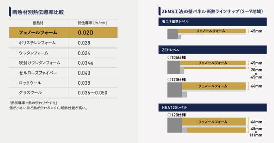 「ZEMS工法では、世界最高レベルの断熱性能を誇るフェノールフォームを使用しています。このフェノールフォームは一般的な断熱材に比べて約2倍の断熱効果を持ち、耐久性も高い特長があります。この優れた断熱性能により、一年中快適に過ごすことができ、さらに省エネ効果も期待できます。」