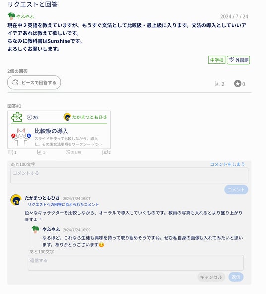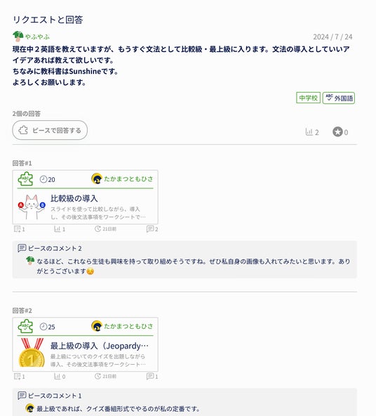 ピースにはコメントをつけることもできるので、授業アイデアを介して先生同士が交流し、さらに知見を深めることに繋がります。