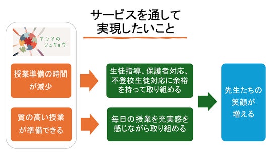 アシタのジュギョウではリクエスト機能を通して、サービス内のコンテンツが増え、まさに「明日の授業」が探せる場所となることを目指しています。教員の業務は授業だけではありませんが、授業準備が効率化されることは「先生たちの笑顔」につながると考えています。
