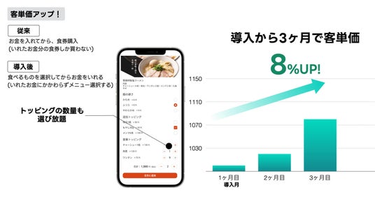 また、都度入金の手間が無いことや複数注文が可能なUIを提供するなどの工夫で、お客様あたりの売上が平均8%向上しました。