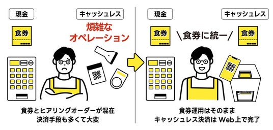 ・食券券売機を利用して運営している飲食店では、決済後にお客様に直接注文内容を確認し、紙にメモ書きして食券とするなど、複雑なオペレーションが発生する場合が多い。