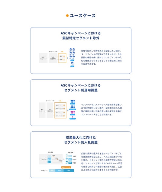 MetaのAIによる広告配信技術であるASC(Advantage+ ショッピングキャンペーン)は、通常の広告配信は大きく上回る成果の最大化が期待できますが、年齢や性別を絞るなどの運用調整を行なうことができないという欠点があります。