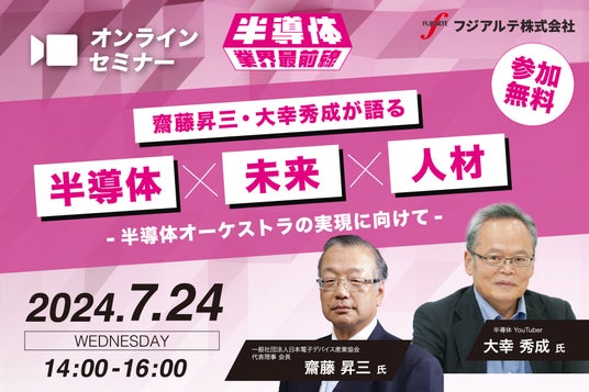 「ひとが輝く。みらいが動く。」をブランドメッセージに掲げ、製造派遣、製造アウトソーシングなどを展開する総合人材サービス業 フジアルテ株式会社(以下、当社)は、「半導体業界最前線!」と題し、元 東芝副社長であり一般社団法人 日本電子デバイス産業協会(NEDIA) 代表理事・会長である齋藤 昇三 氏と、半導体YouTuberである大幸 秀成 氏ご登壇による無料オンラインセミナーを、7/24(水)14時より開催します。