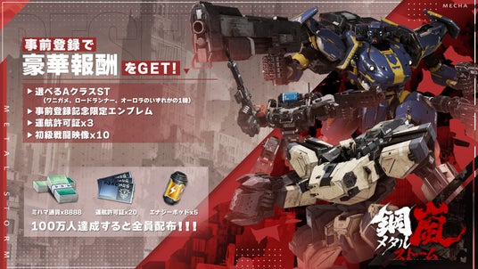 本日より、『鋼嵐 - メタルストーム』正式リリース版の事前登録を開始いたしました。事前登録特設サイトでのメールアドレスの登録、App Store、Google Play、PC版で事前登録を受付中です。
