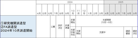 採択された場合は、令和6年10月~令和7年9月までの1年間を支援期間として予定しています。また、支援期間中に行う継続審査を通過することで、次の支援期間も継続して支援を受けることが可能です。