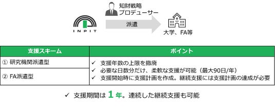 採択されると、知的財産マネジメントの専門家である知財戦略プロデューサー(知財PD)が派遣され1年間に最大90日分の知財支援を行います。