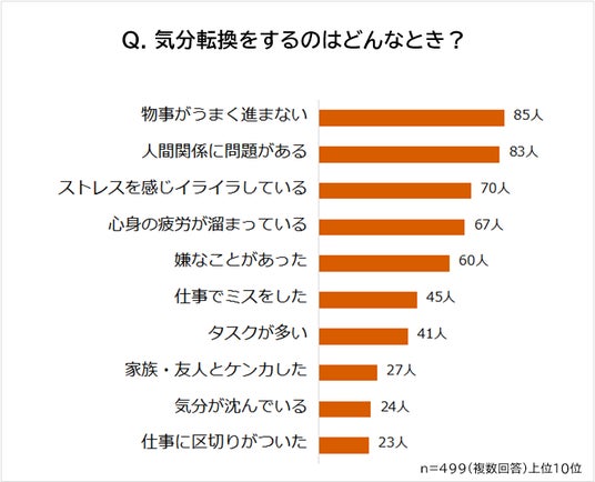 社会人499人に、気分転換するのはどんなときかを聞いたところ、1位は「物事がうまく進まない(85人)」、2位は「人間関係に問題がある(83人)」でした。