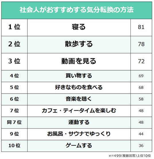 そこで今回、株式会社R&G( https://r-andg.jp/ )は、社会人499人に「気分転換の方法」についてアンケート調査を実施。その結果をランキング形式でまとめました。